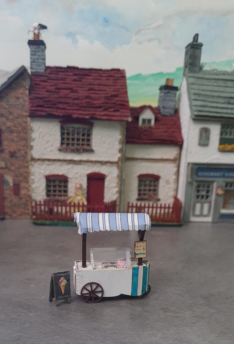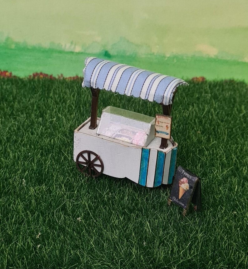 Add a touch of nostalgic charm to your miniature world with this handcrafted 1:48 scale ice cream cart. Carefully made by hand , this piece is perfect for dollhouse collectors, miniature enthusiasts, and diorama creators.